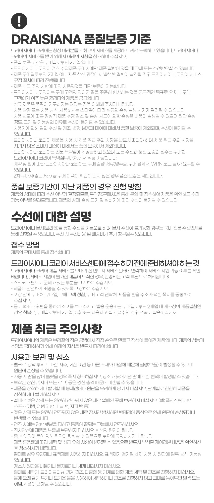 DRAISIANA의 품질보증 기준은 상세설명 하단 참조하기 바라며, CIRCLES CULT CLUB을 통해 접수 또는 문의해주시면 됩니다.