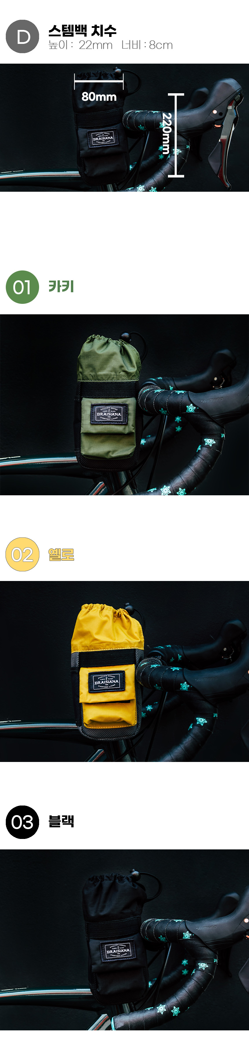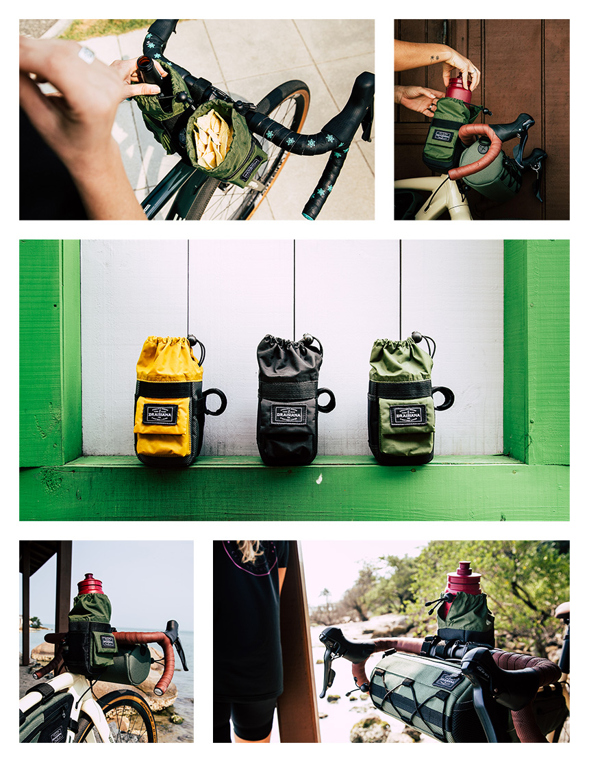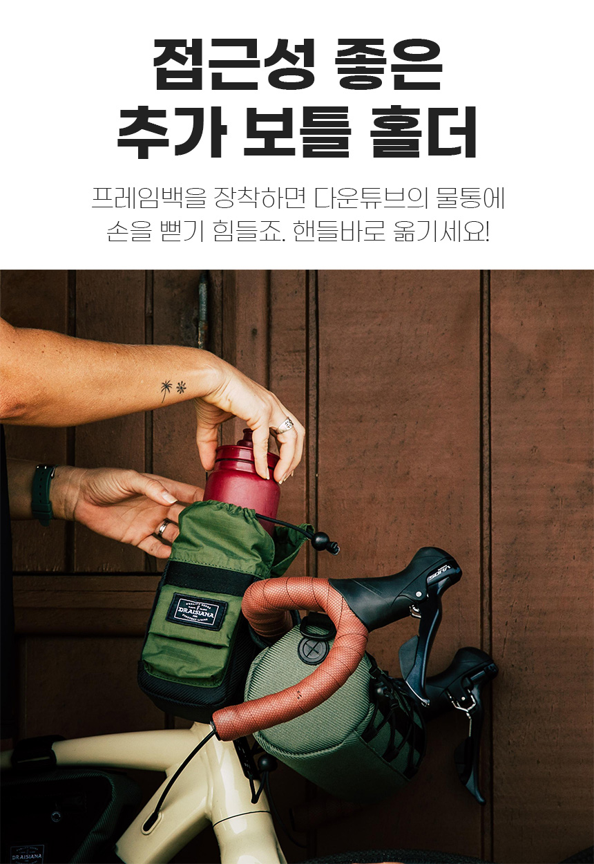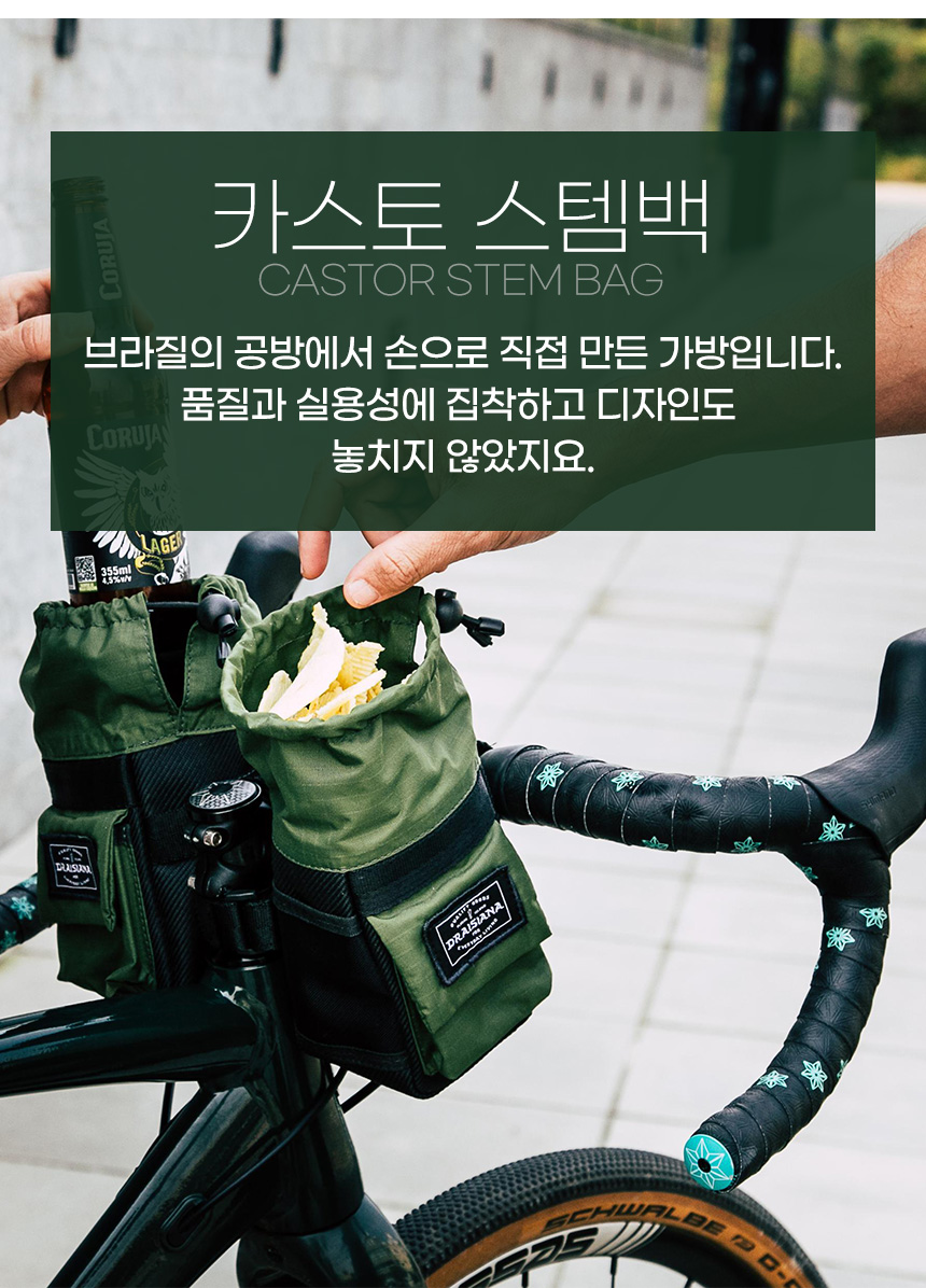 CASTOR STEM BAG은 프레임 백 장착시 다운튜브의 보틀 케이지에 손을 뻗기 힘들때 핸들바에 물을 보관할 수 있는 탁월한 옵션입니다.
