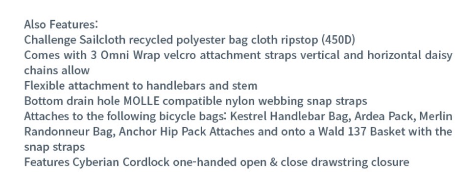 두 개의 장착 시스템이 있는 SIDEKICK은 포함된 3개의 벨크로 스트랩을 이용해 스템과 핸들바에 부착되거나 MOLLE 스냅 스트랩으로 KESTREL HANDLEBAR BAG, ARDEA PACK, ANCHOR HIP PACK에 부착 가능합니다.