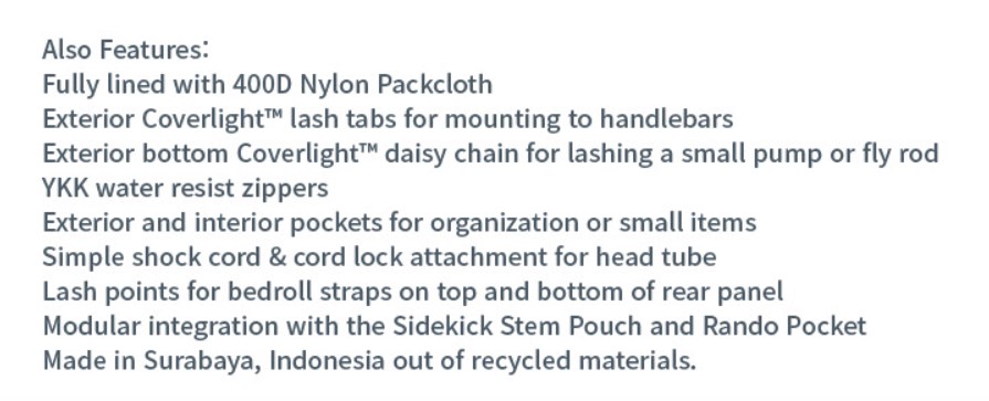 KESTREL HANDLEBAR BAG은 핸들바 기능을 위해 특별히 제작되었고, 가방 뒤쪽에 SIDEKICK STEM POUCH 또는 RANDO POCKET을 장착해 휴대성을 높일 수 있습니다.