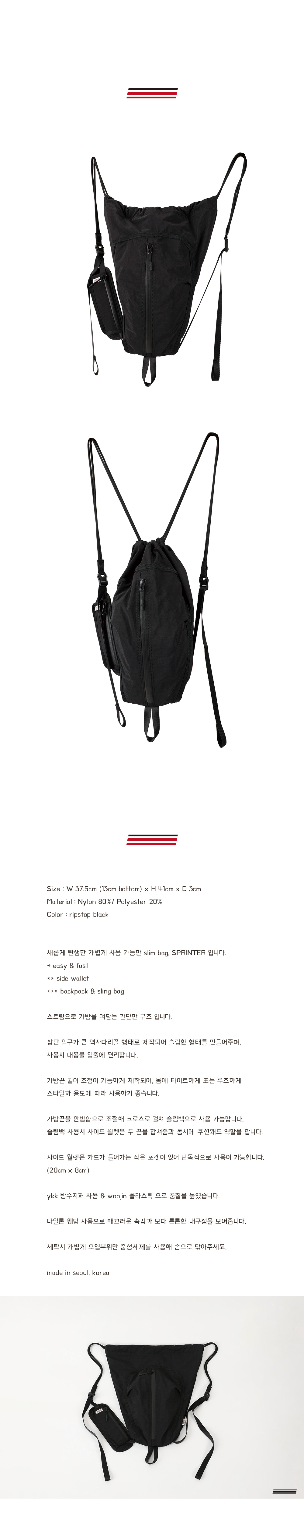 다양한 착용과 형태로 변형 가능한 SACK PACK, SPRINTER 입니다.