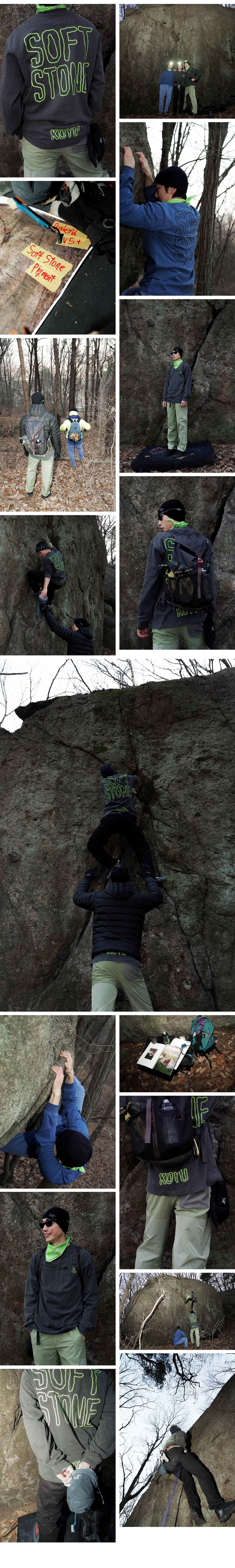 SOFT STONE은 날카로운 바위의 그립이 따뜻하고 부드러웠으면 하는 클라이머의 마음을 표현했고 여유로운 핏 감으로 누구나 편하게 입을 수 있습니다.