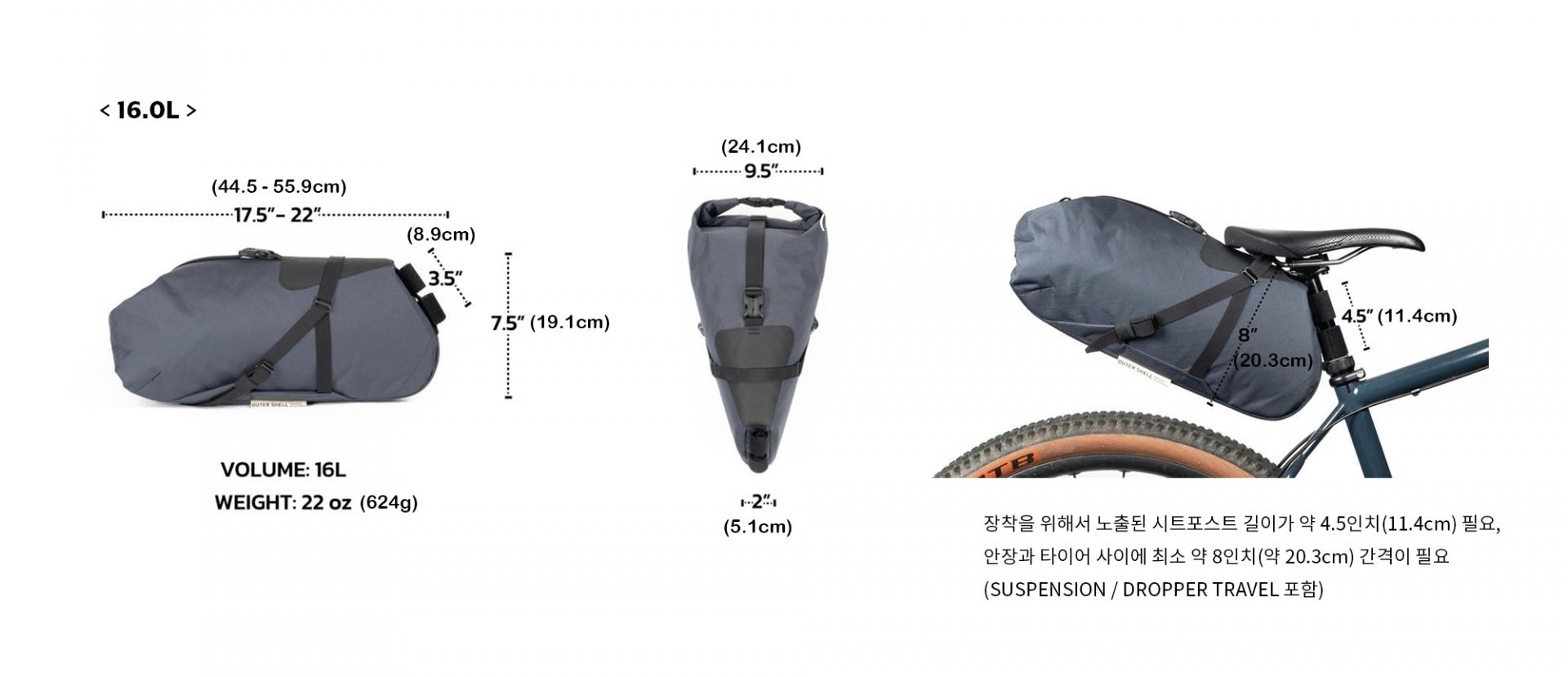 필요한 공간과 자전거에 맞는 크기에 따라 10.5L와 16.0L 두 가지 사이즈로 제공됩니다.