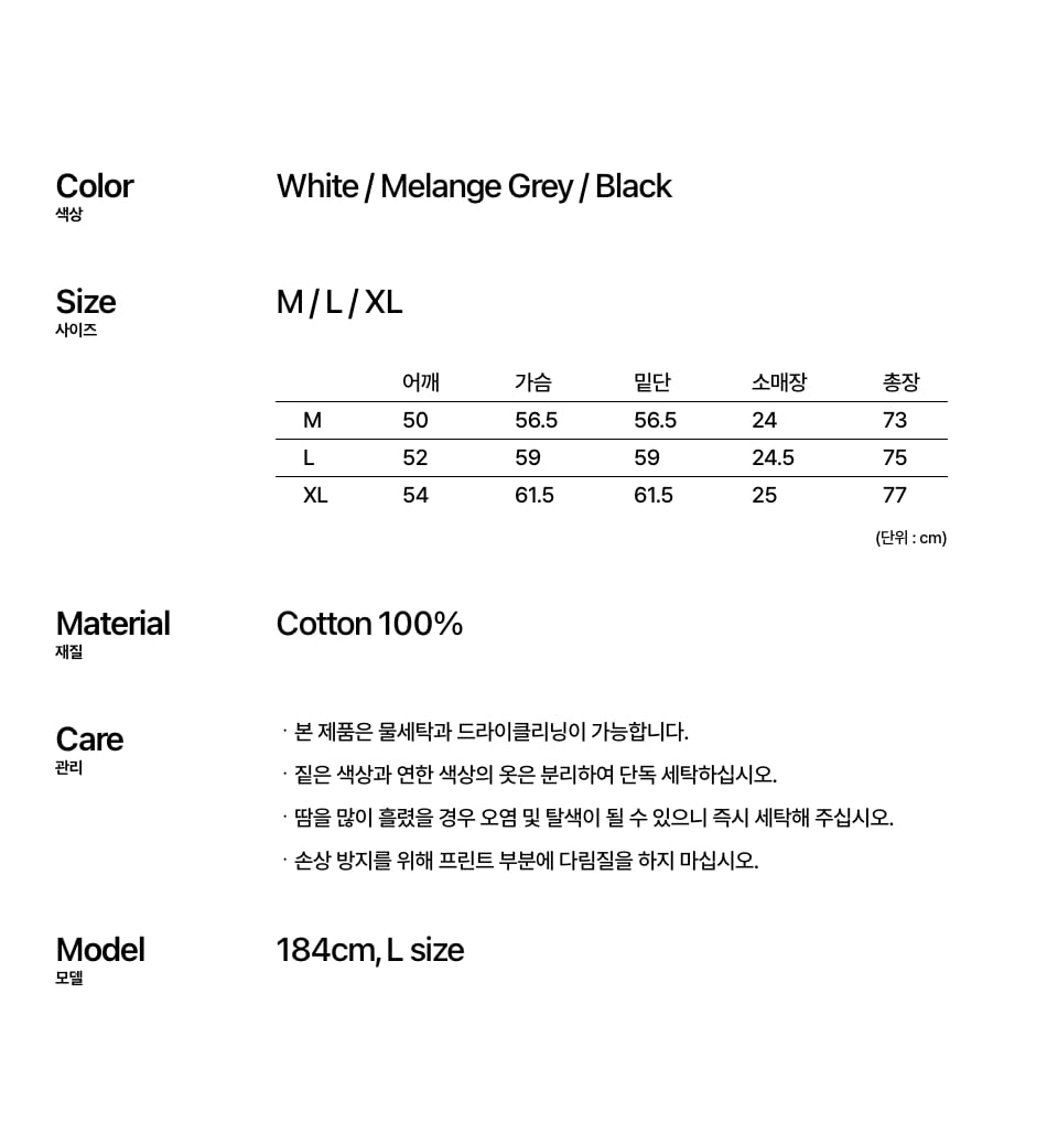 M : 어깨 50CM / 가슴 56.5CM / 밑단 56.5CM / 소매장 24CM / 총장 73CM