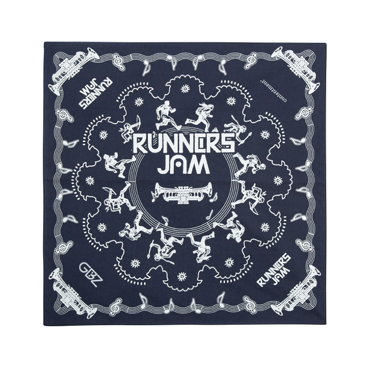 러너들이 서로의 박자에 맞춰 발을 맞춰 뛰는 모습을 담은 RUNNING JAM 반다나입니다.