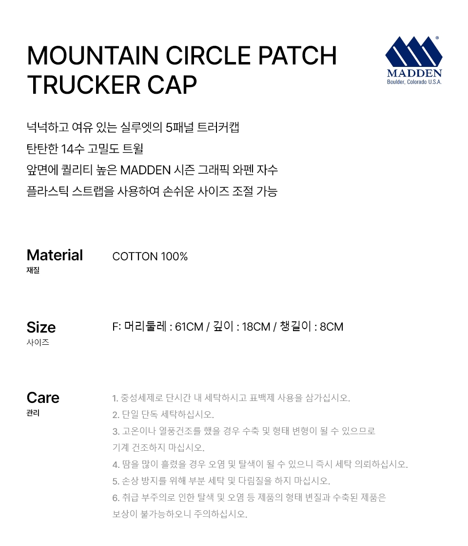 F : 머리둘레 : 61CM, 깊이 : 18CM, 챙길이 : 8CM