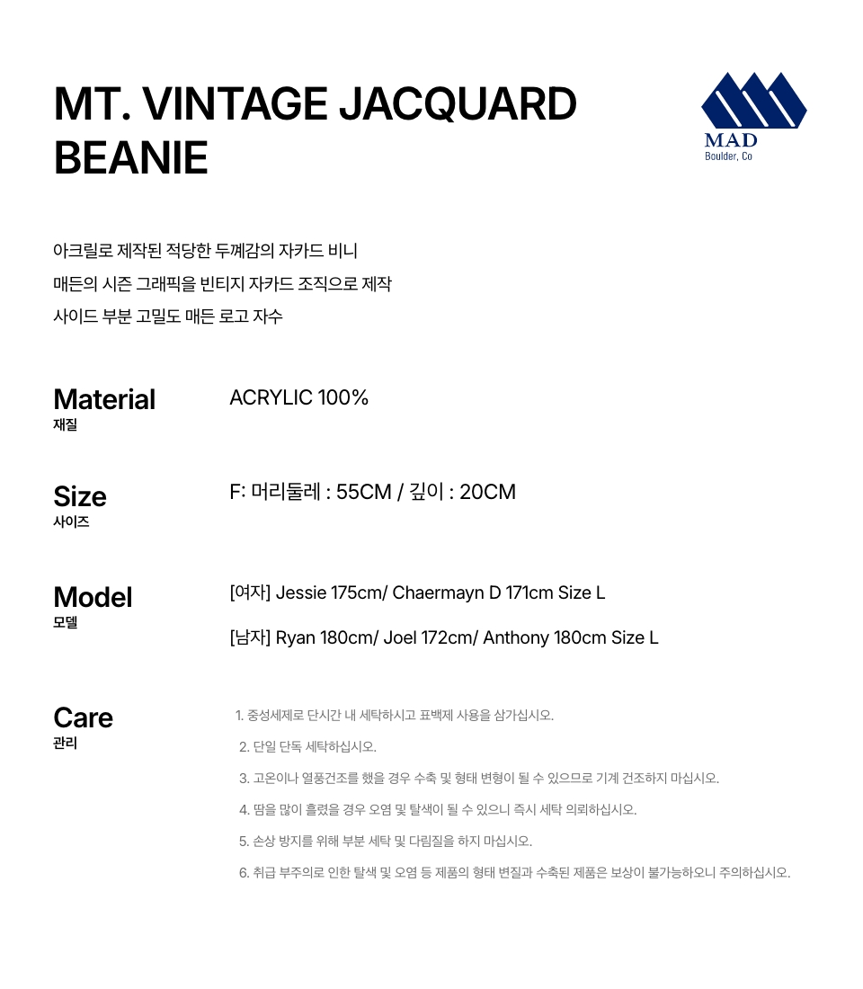 아크릴로 제작된 적당한 두꼐감의 자카드 비니입니다.