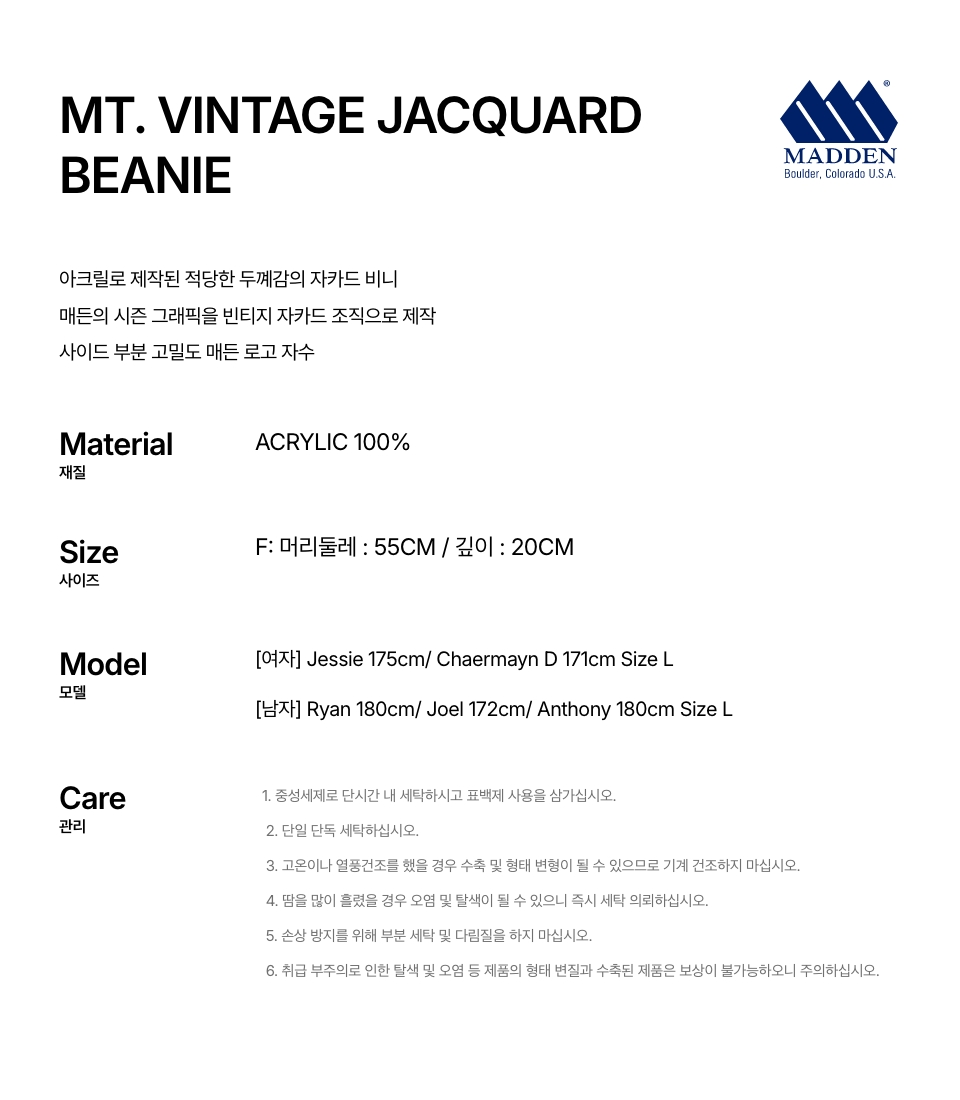 아크릴로 제작된 적당한 두꼐감의 자카드 비니입니다.