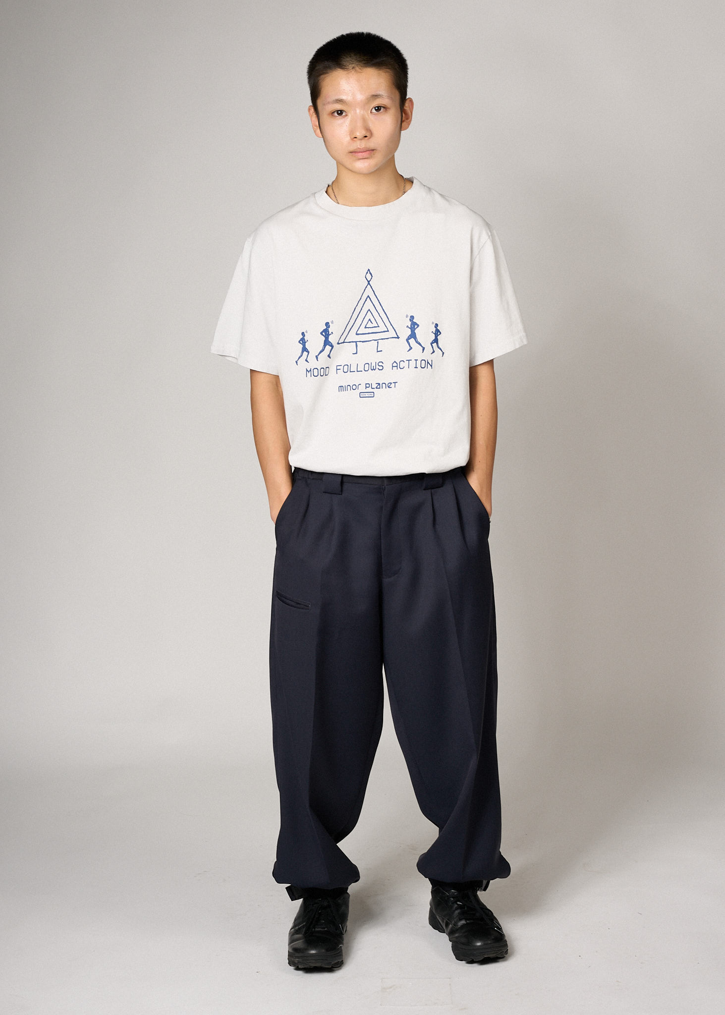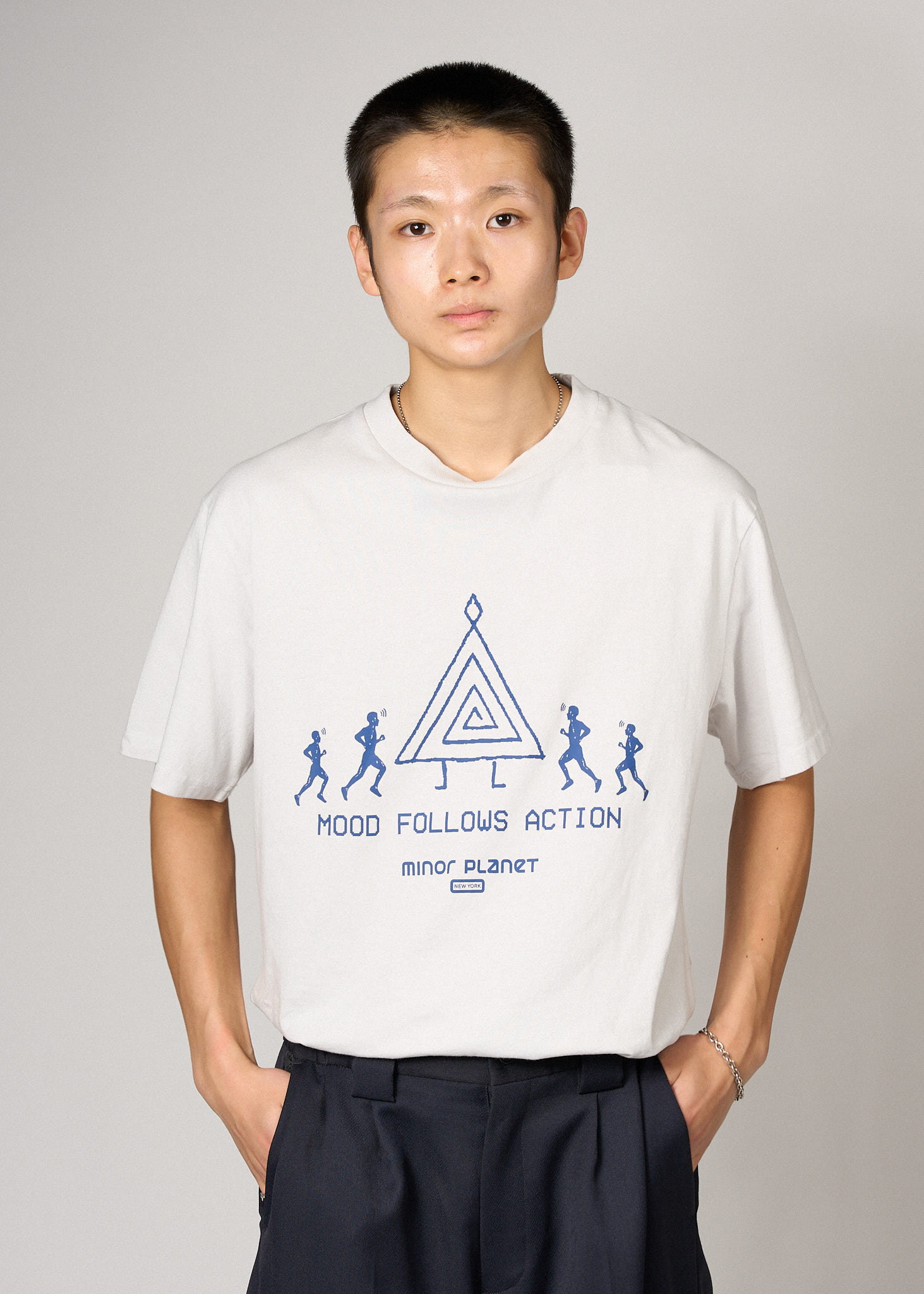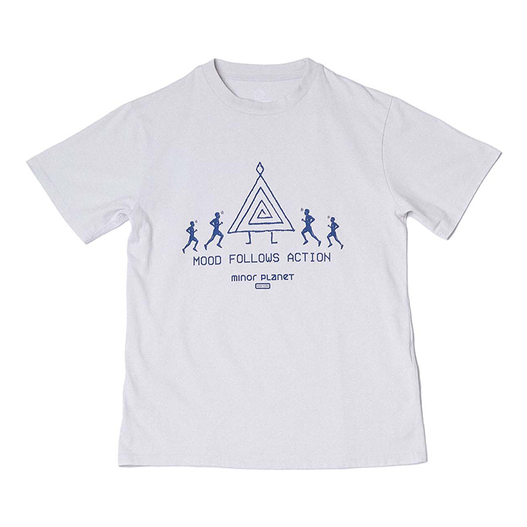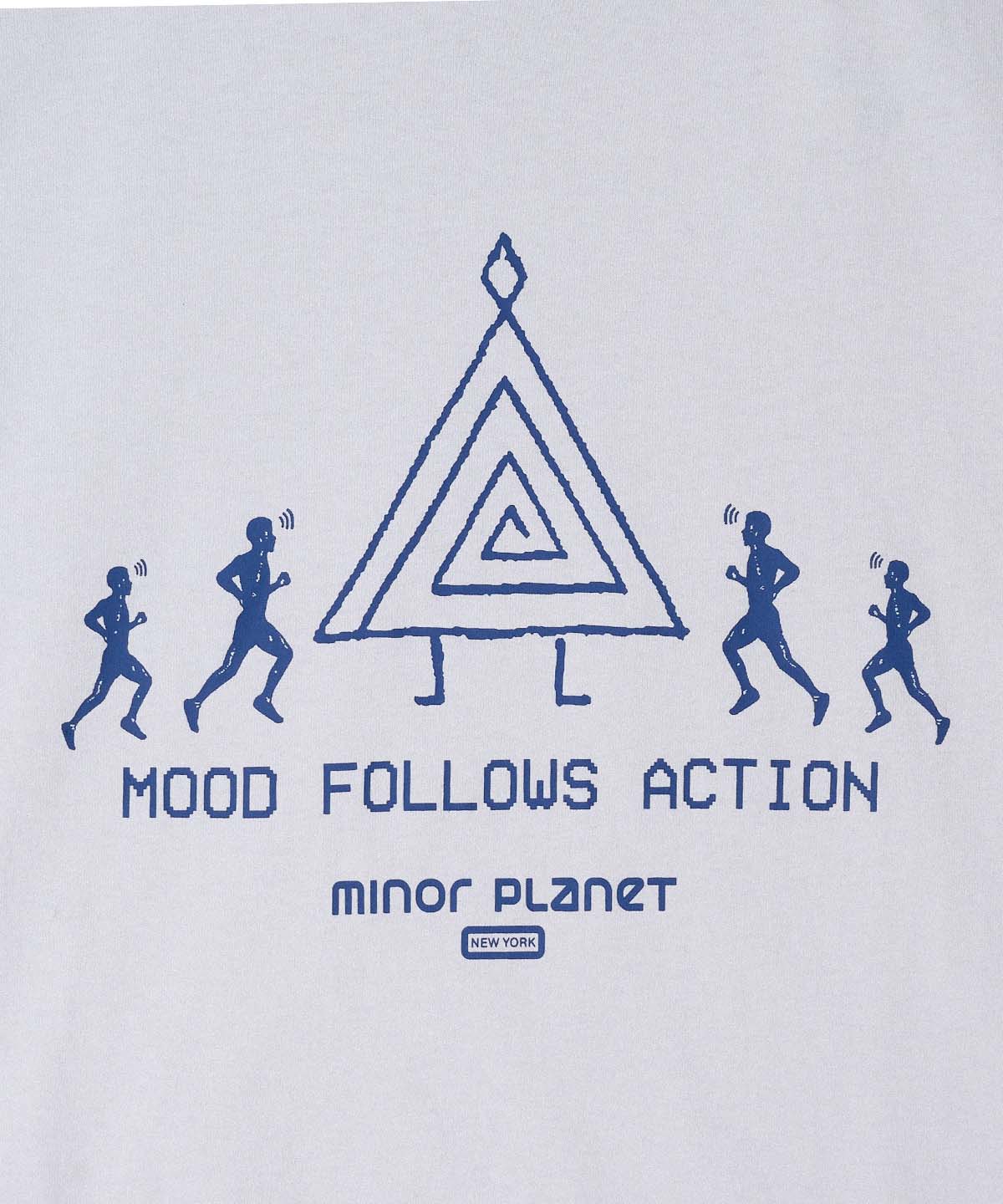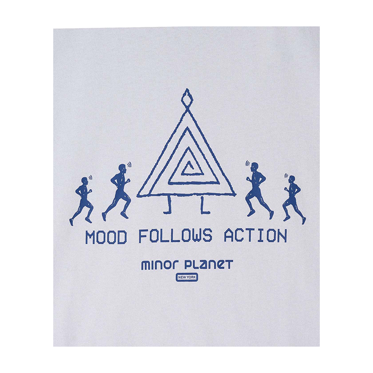 전면에는 네이비 컬러의 "MOOD FOLLOWS ACTION" 문구와 고대 심볼, 그리고 마인드풀 러너 그래픽이 함께 배치되어 있습니다.