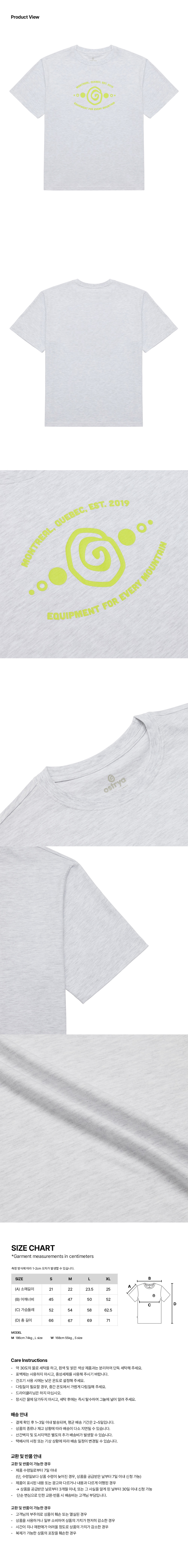 M 사이즈 - 총길이 : 67.0, 어깨너비 : 47.0, 가슴둘레 : 54.0, 소매길이 : 22.0