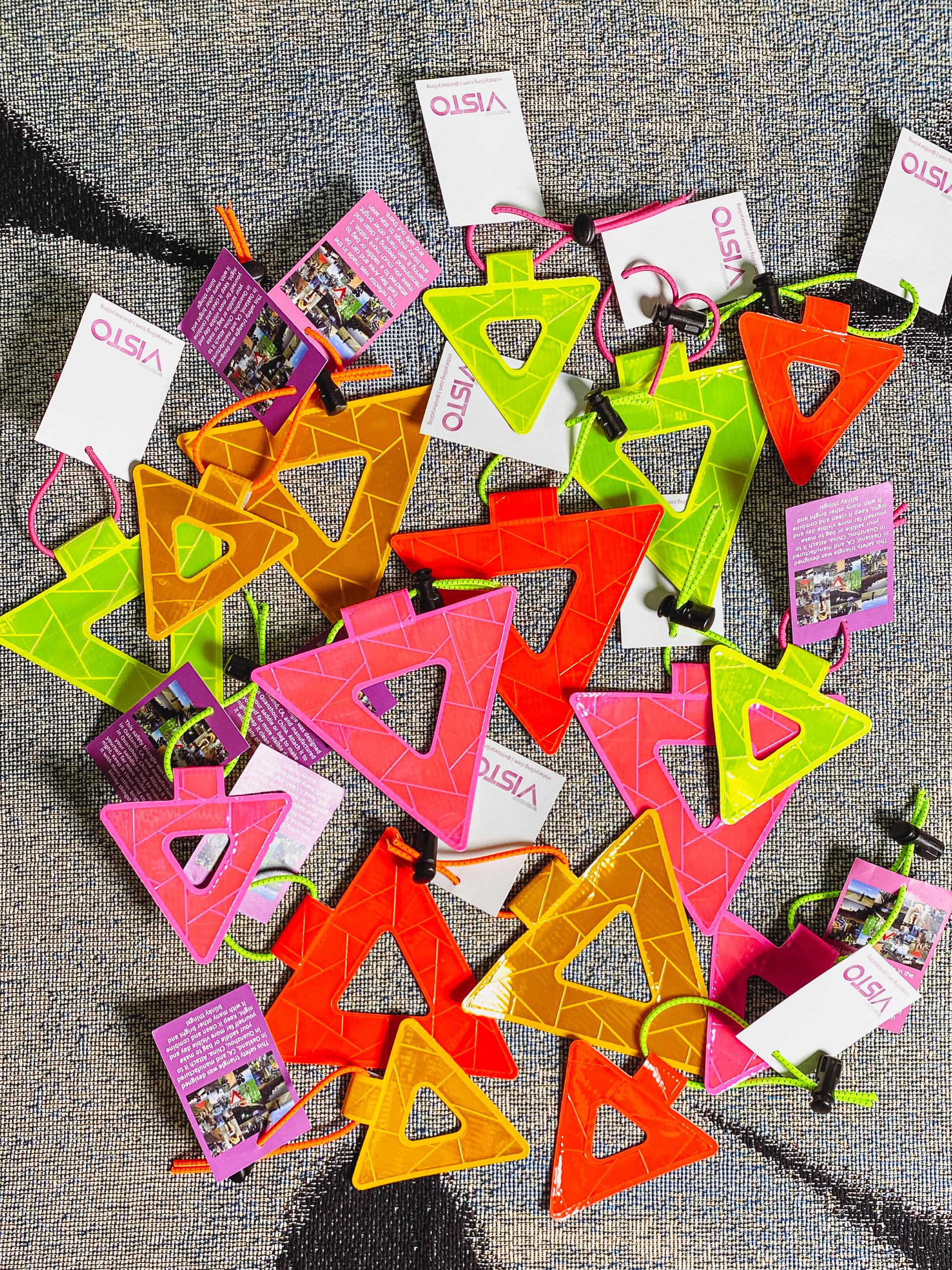 뒷면에는 VISTO 로고 패턴, 앞면에는 삼각형과 육각형이 이어진 기하학 패턴