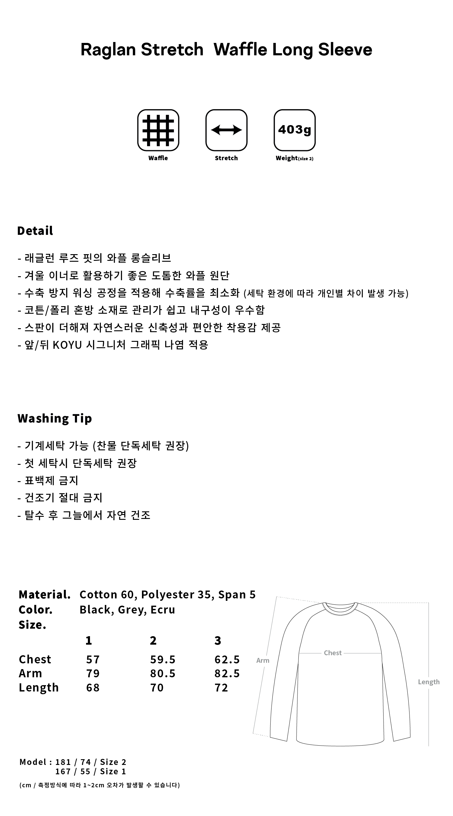 3 SIZE - CHEST : 62.5cm / ARM : 82.5cm / LENGTH : 72.0cm