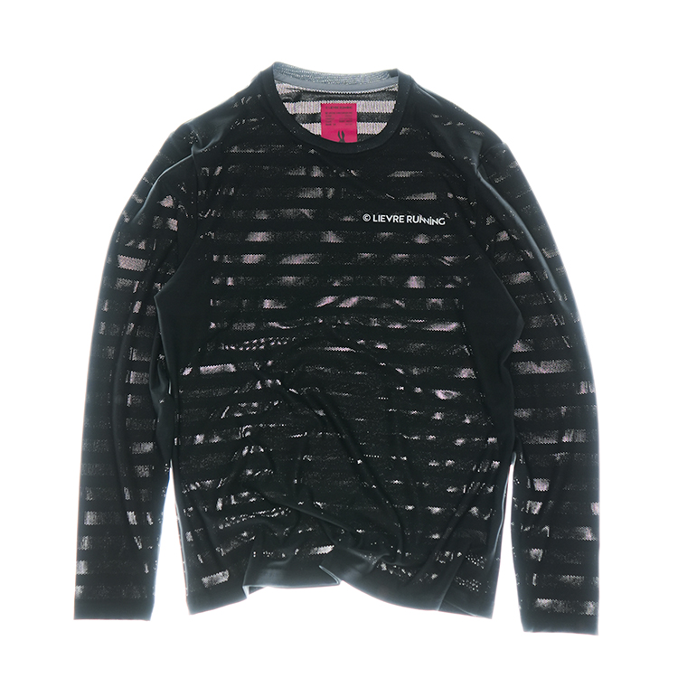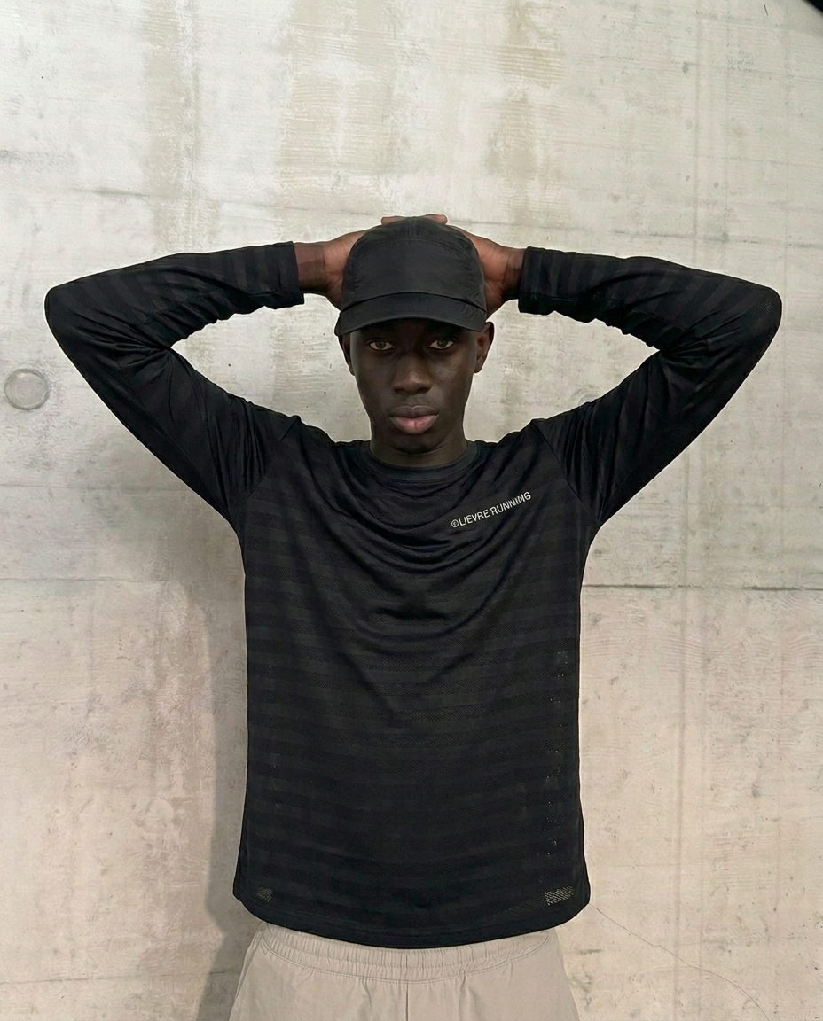 LOVE OF RUNNING CAPSULE의 퓨어 블랙 롱슬리브는 이번 컬렉션을 상징하는 핵심 아이템입니다.
