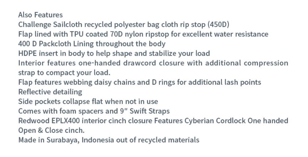 내부 압축 스트랩은 가방의 무게를 자전거에 더 가깝게 당겨 화물을 압축하고 팽팽하게 유지시켜 줍니다.