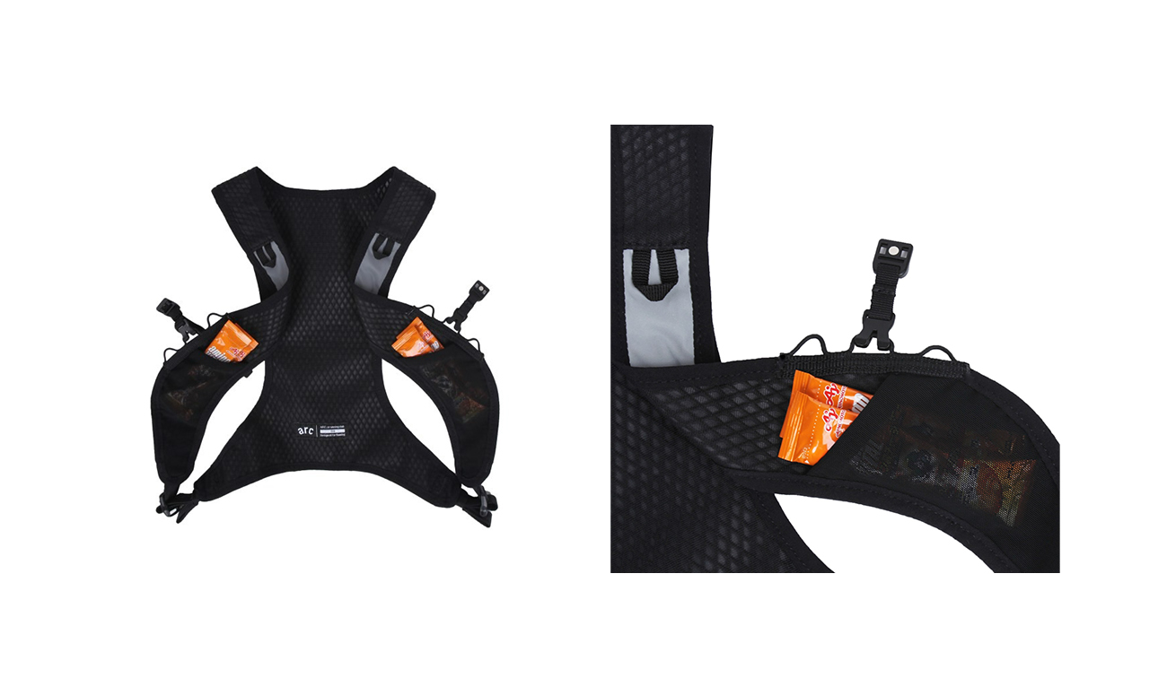 | DETAILS & FABRIC 소재 및 정보 2 INNER POCKETS FOR ESSENTIAL – 에너지젤 등 가벼운 물건의 휴대를 위한 안 주머니 2 BACK POCKETS FOR BEACON – 클립형 비컨 장착을 위한 뒷편 주머니 3M REFLECTIVE PANELS – 고휘도 3M 리플렉티브 소재 사용으로 야간 시 높은 가시성 제공 ADJUSTABLE & MOVABLE CHEST BUCKLE – 사이즈 조절 및 상하 위치 이동이 가능한 가능한 버클과 웨빙 ADJUSTABLE SIDE WEBBING – 사이즈 조절 가능한 측면 웨빙